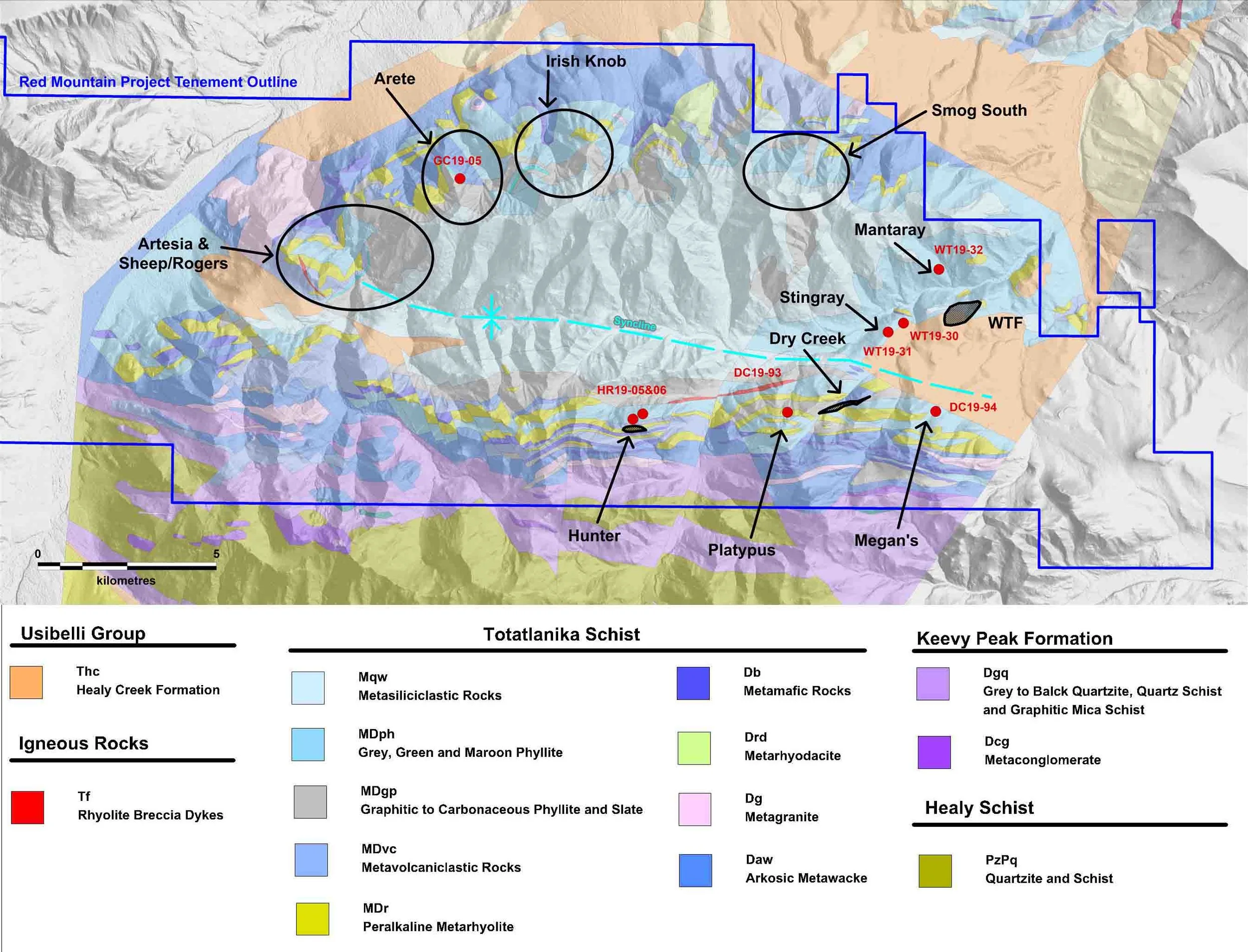 Subsequently, White Rock expanded the Red Mountain tenement package to 143km², which covered the best geochemical targets along both limbs of the syncline (Figure 6), including a significant area down-dip of the exposed prospective VMS horizon. The expanded tenement position provided White Rock with a significant land package containing numerous targets with the potential for additional deposits that could transform the Red Mountain project into Alaska’s next development project.